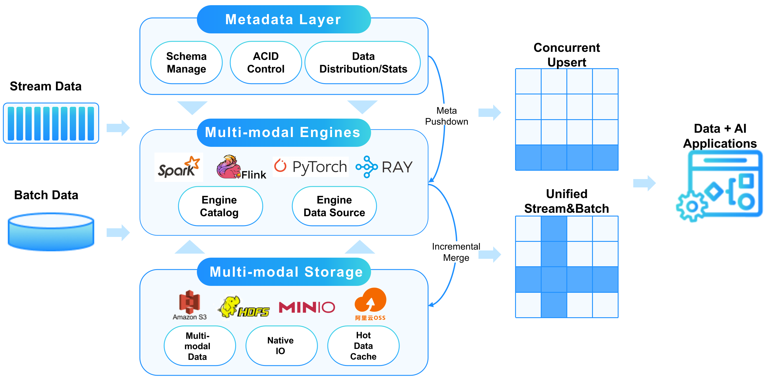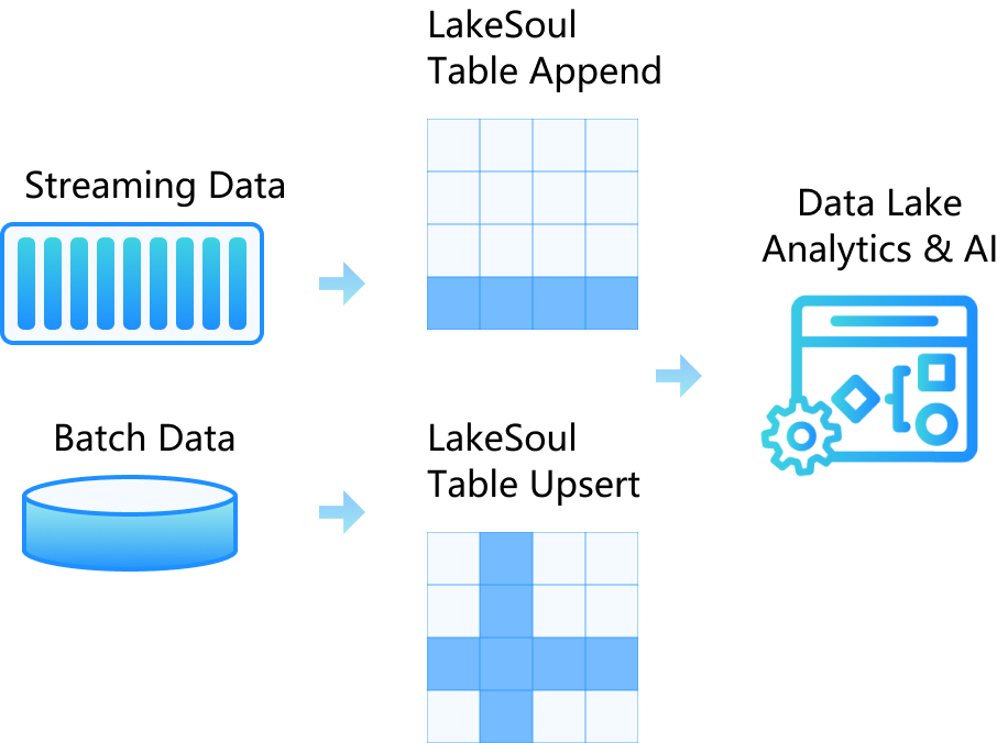 LakeSoul natively supports writing multiple streams into one table with primary key, and enables building real-time tabular dataset for AI applications